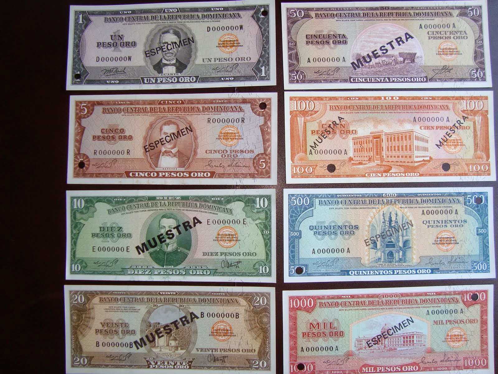 Los primeros billetes nacionales emitidos fueron de las denominaciones de RD$1, RD$5 y RD$10, estos se diseñaron de manera similar a los dólares norteamericanos en lo referente a su tamaño y características, por la fábrica American Bank Note Company, en el año 1947.