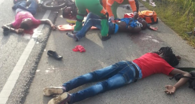 HIGÜEY.- Al menos cuatro personas fallecieron al producirse un choque entre dos motocicletas en el tramo Jobo Dulce de Higüey. Hasta el momento los fallecidos no han sido identificados. Dos de los cuatro muertos resultaron calcinados, debido a que una de las motocicletas se incendió. En el lugar se encuentran miembros de la Policía Nacional y la Defensa Civil, al igual que un médico legista, para los fines correspondientes.