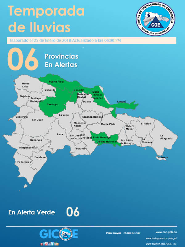 La Dirección del Centro de Operaciones de Emergencias (COE), informa que emite alerta verde por posibles inundaciones repentinas urbanas y rurales, crecidas de ríos arroyos y cañadas, así como deslizamientos de tierra, para las provincias: Samaná, María Trinidad Sánchez, Espaillat (en especial Gaspar Hernández), Santiago, Puerto Plata y El Gran Santo Domingo. La alerta se produce a raíz del boletín de la tarde de este jueves, de la Oficina Nacional de Meteorología “ONAMET, el cual establece una vaguada en altura, localizada sobre el país.