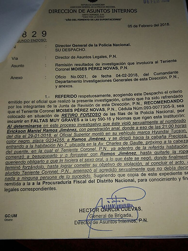 Conforme a la investigación, el oficial superior habría montado en su vehículo al joven y se dirigió a la referida cabaña Preciosa, donde supuestamente violó al joven Romos Jiménez, según el informe de la pesquisa policial. El agresor habrá amenazado a su víctima para que no dijera nada a nadie de lo sucedido, pero el joven decidió hacer la denuncia en el Palacio de la Policía Nacional. La Dirección General de Asuntos Internos recomendó, además, que el expediente de la investigación sea enviado a la Fiscalía del Distrito Nacional para que el teniente coronel sea sometido a la justicia.