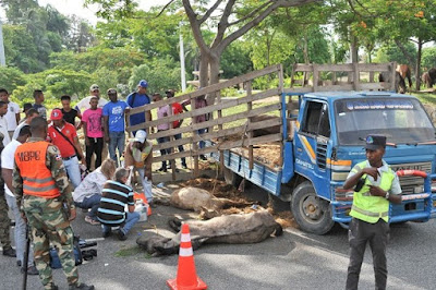 La Unidad de Protección Animal de la Procuraduría general de la República apresó ayer una pareja de esposos sorprendidos transportando 15 caballos en condiciones deplorables. Se trata de los esposos Silvia de La Cruz y Orlando de La Cruz, quienes supuestamente habían comprado los animales por 64 mil pesos en la comunidad de Mata Palacio, de San Pedro de Macorís para venderlos en el mercado de Elías Piña.