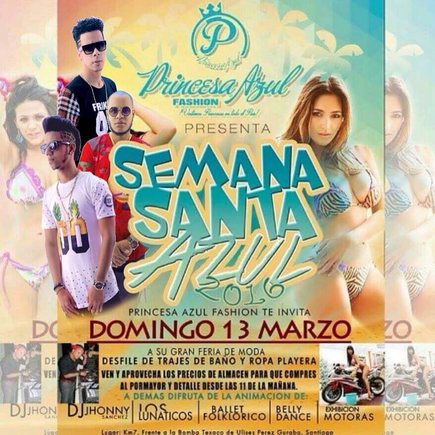 Princesa Azul Fashion presenta este domingo 13 de marzo su gran feria de moda y desfile de trajes de baño y ropa playera ‘’SEMANA SANTA AZUL 2016’’. Princesa Azul Fashion esta en el km7, frente a la bomba Texaco de Ulises Perez, Gurabo, Santiago.. En vivo la presentación de Dj-Jhonny / Los Lunaticos / Belly Dance / Ballet Folklorico y Exhibición de Motoras. No te lo puedes perder!! Invita.: www.bolivarpower.com...