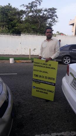 “Ayer, durante un pique que cogí en mi casa, en modo de desesperación se me ocurrió la idea de ir al Banco Central para ver si me dan un empleo ahí, porque mi experiencia es básicamente de bancos. Y nada, imprimí 130 currículums para darle uno a todo el que todo el que pasara”, relata Anderson Gómez, quien está desesperado por conseguir un trabajo. El hombre de 36 años, salió esta mañana de su hogar en Cristo Rey, imprimió 130 hojas de vida, se paró a las afueras del Banco Central y junto a un cartel amarillo dónde plasmó: “Tengo 11 años de experiencia bancaria. Estoy legal. Tome un CV (Currículum Vitae); ¡es gratis! #Soloquierotrabajarypagar”. Con este mensaje logró llamar la atención de las personas que pasaban por el lugar. El motivo que lo movió es que desde hace 11 meses se encuentra desempleado y tiene un hijo de 12 años.