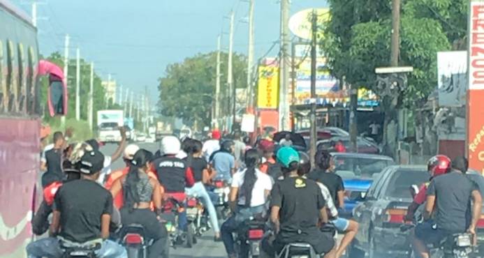 Un grupo de motoristas fue interceptado por agentes de la Policía Nacional en la carretera Mella, en momentos en que realizaba atracos de manera simultánea. El grupo de alrededor de 30 personas, empezó desde la Avenida Charles de Gaulle, esquina carretera Mella, en dirección norte-sur atracando a todo el que estaba a su paso, ante las miradas atónitas de gente que iba en vehículos y guaguas de concho que no podían reaccionar ante tal acción.