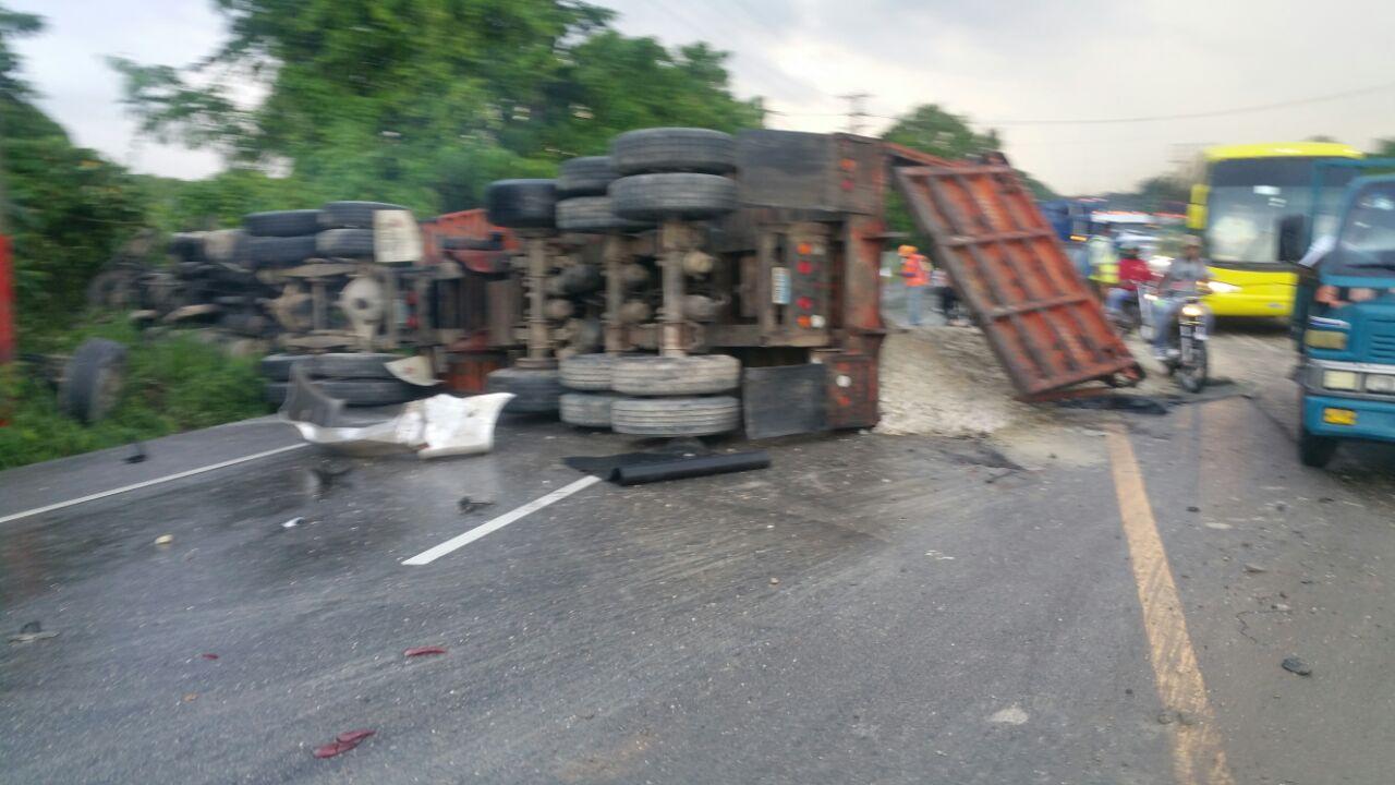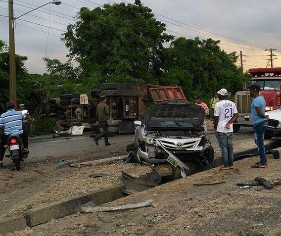 Una patana que cargaba arena se volcó durante la mañana de este martes mientras transitaba en la autopista 6 de Noviembre en dirección Santo Domingo San Cristóbal provocando que varios vehículos se accidentaran. El vocero de la Autoridad Metropolitana de Transporte (Amet), Rafael Tejeda explicó que mientras esa patana se encontraba volcada en sentido opuesto, otra patana impactó varios vehículos. Tejeda indicó que no hay fallecidos ni heridos de gravedad, por lo que la situación está controlada, aunque el tránsito aún permanece congestionado ya que que la patana que se volcó cargaba arena, por lo que todo este material se encuentra en la carretera obstaculizando aún más las vías.