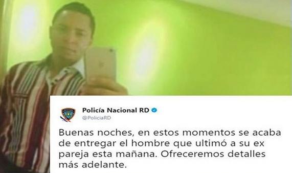 Se entregó anoche a la Policía Nacional, Martín Batista Ogando, señalado como la persona que en horas de la mañana mató de un disparo a su expareja Geraldine Sánchez Baldera. “Buenas noches, en estos momentos se acaba de entregar el hombre que ultimó a su ex pareja esta mañana. Ofreceremos detalles más adelante”, informó la Policía a través de su cuenta de Twitter. Previamente, la Policía informó que había recuperado el vehículo en que se transportaba el agresor, en el parqueo de una tienda ubicada en la avenida 27 de Febrero.