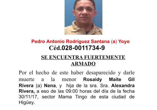 Higüey.- Responde al nombre de Pedro Antonio Rodríguez Santana, alias Yoyo, el hombre que es buscado tras ser señalado como sospechoso en el caso de la muerte de la niña de 11 once años en Higüey, cuyo cadáver fue encontrado justamente detrás de la Junta Distrital del distrito municipal La Otra Banda, ubicada a ocho kilómetros del centro de Higüey.